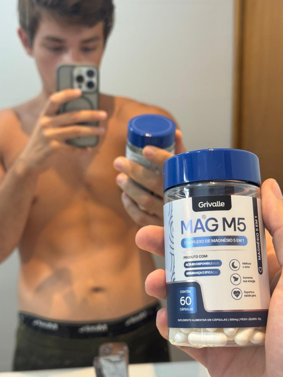 O Mag M5 é uma fórmula completa com 5 tipos de magnésio que atua em: • Sono • Energia • Foco • Recuperação muscular • Redução do estresse